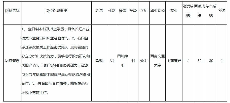 根據(jù)四川長(zhǎng)虹網(wǎng)絡(luò)科技有限責(zé)任公司發(fā)布的招聘公告及招聘相關(guān)規(guī)定,經(jīng)筆試、面試等程序,現(xiàn)將筆試(面試)成績(jī)予以公示。