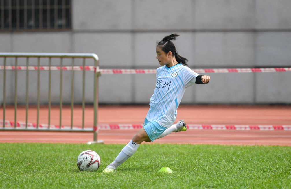 2023年4月15日,練昱彤在深圳寶安體育場練習射門。新華社記者 毛思倩 攝