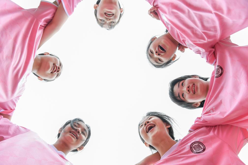 5月11日,練昱彤(左上)在深圳市紅嶺中學石廈初中部參加校隊訓練賽時與隊友互相加油鼓勁。新華社記者 毛思倩 攝