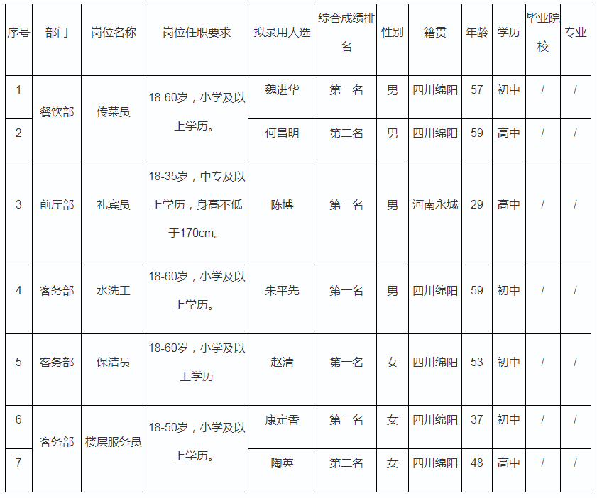 根據(jù)綿陽(yáng)富樂(lè)山九洲國(guó)際酒店有限公司發(fā)布的招聘公告及招聘相關(guān)規(guī)定,經(jīng)面試、體檢等程序,錄用魏進(jìn)華等7名同志到客務(wù)部、餐飲部工作,現(xiàn)予以公示,具體情況如下: