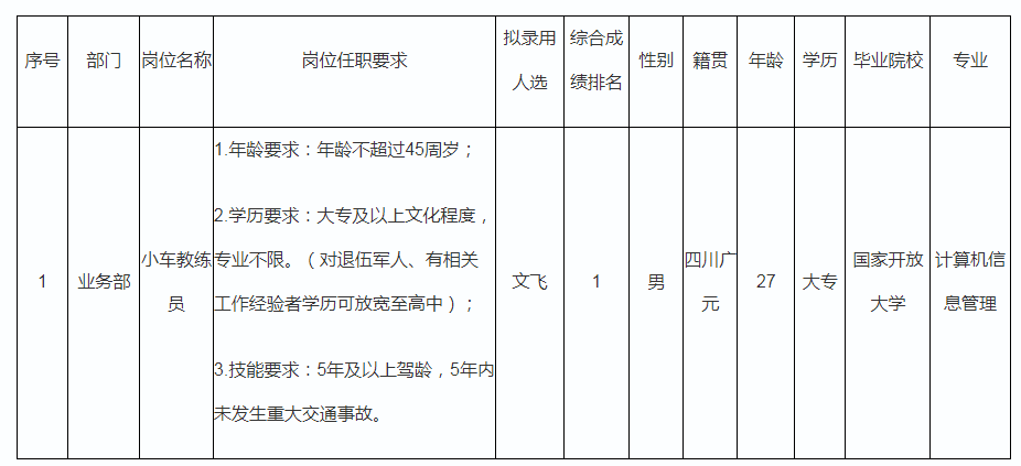 根據(jù)綿陽(yáng)市汽車實(shí)驗(yàn)駕駛技術(shù)學(xué)校股份有限公司發(fā)布的招聘公告及招聘相關(guān)規(guī)定,經(jīng)面試、實(shí)操、考察、體檢等程序,擬錄用文飛同志到綿陽(yáng)市汽車實(shí)驗(yàn)駕駛技術(shù)學(xué)校股份有限公司工作,現(xiàn)予以公示,具體情況如下: