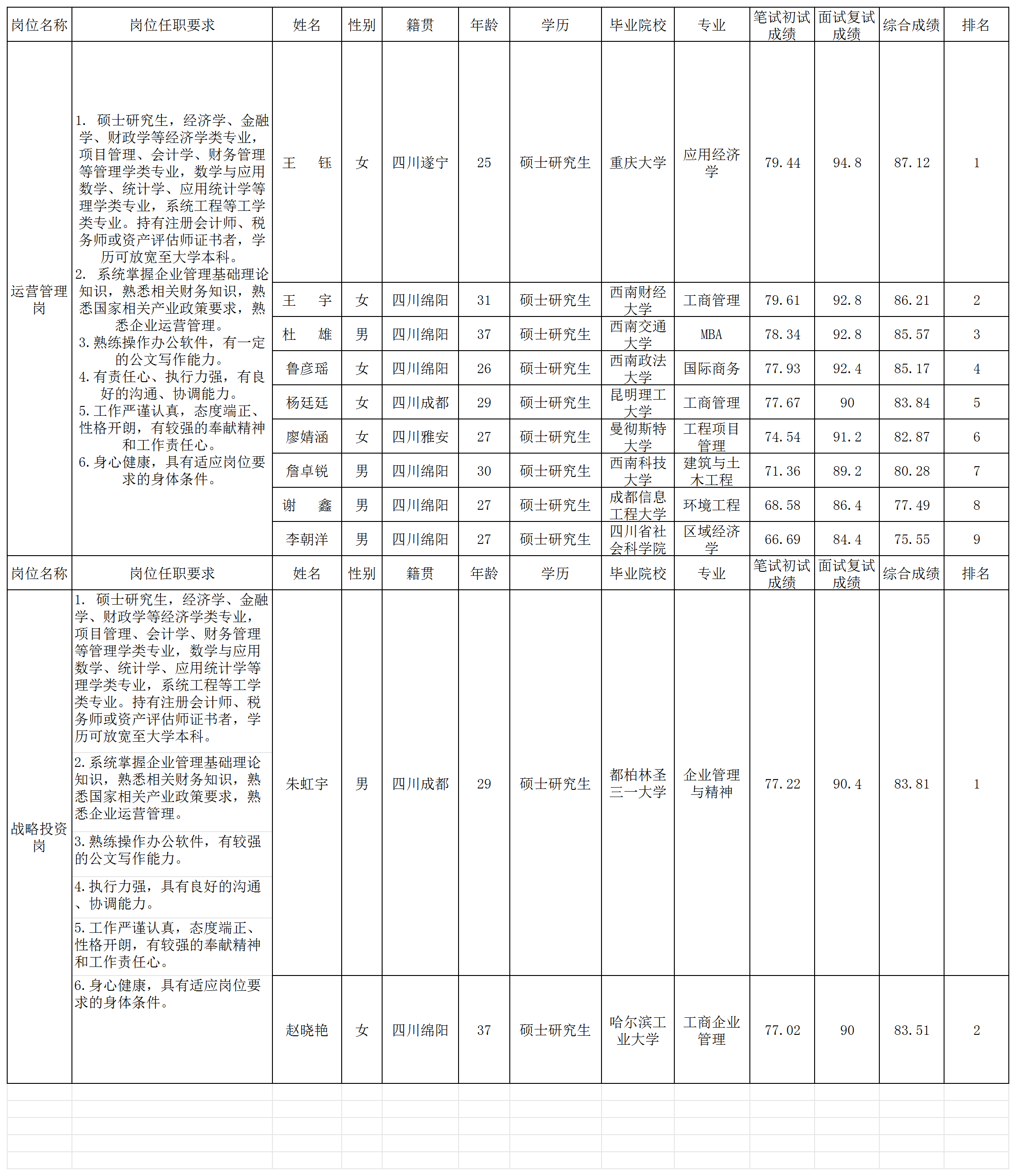 根據(jù)綿陽市投資控股(集團)有限公司發(fā)布的招聘資本運營中心運營管理崗、戰(zhàn)略投資崗的公告及招聘相關規(guī)定,經(jīng)筆試初試、面試復試相關程序,現(xiàn)將初試綜合成績予以公示。