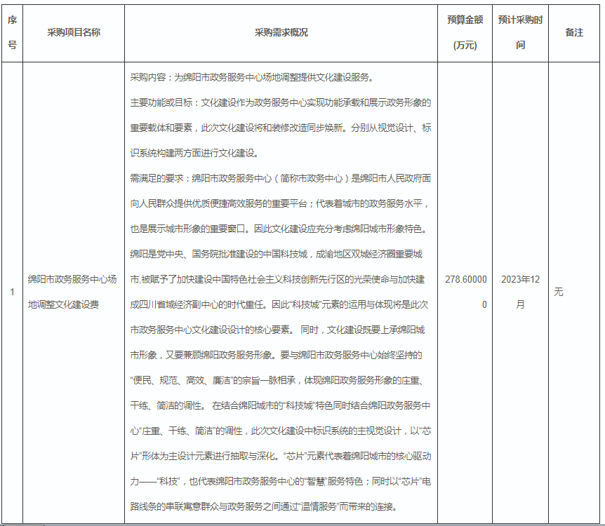 為便于供應(yīng)商及時了解政府采購信息,根據(jù)《四川省財政廳關(guān)于開展政府采購意向公開工作的通知》(川財采〔2021〕153號)要求,現(xiàn)將綿陽市政務(wù)服務(wù)監(jiān)督管理局2023年度(第8批)采購意向公開如下: