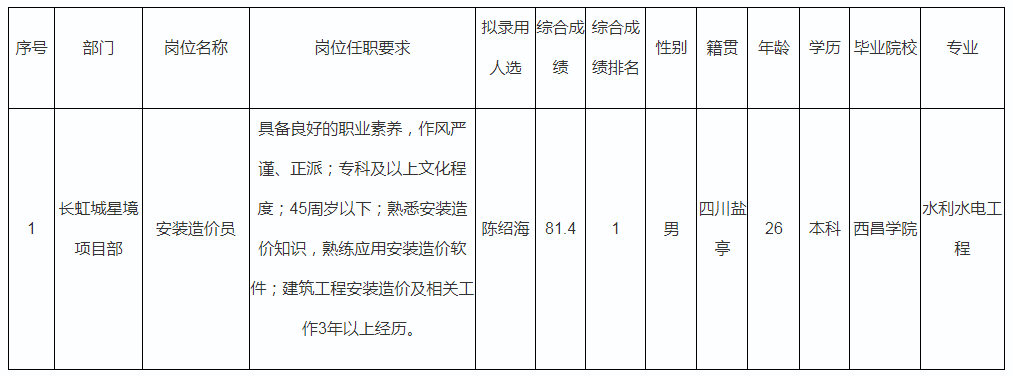 根據(jù)四川虹尚建筑工程有限公司發(fā)布的招聘公告及招聘相關(guān)規(guī)定,經(jīng)筆試、面試、考察、體檢等程序,擬錄用陳紹海同志到安裝造價員崗位工作,現(xiàn)予以公示,具體情況如下: