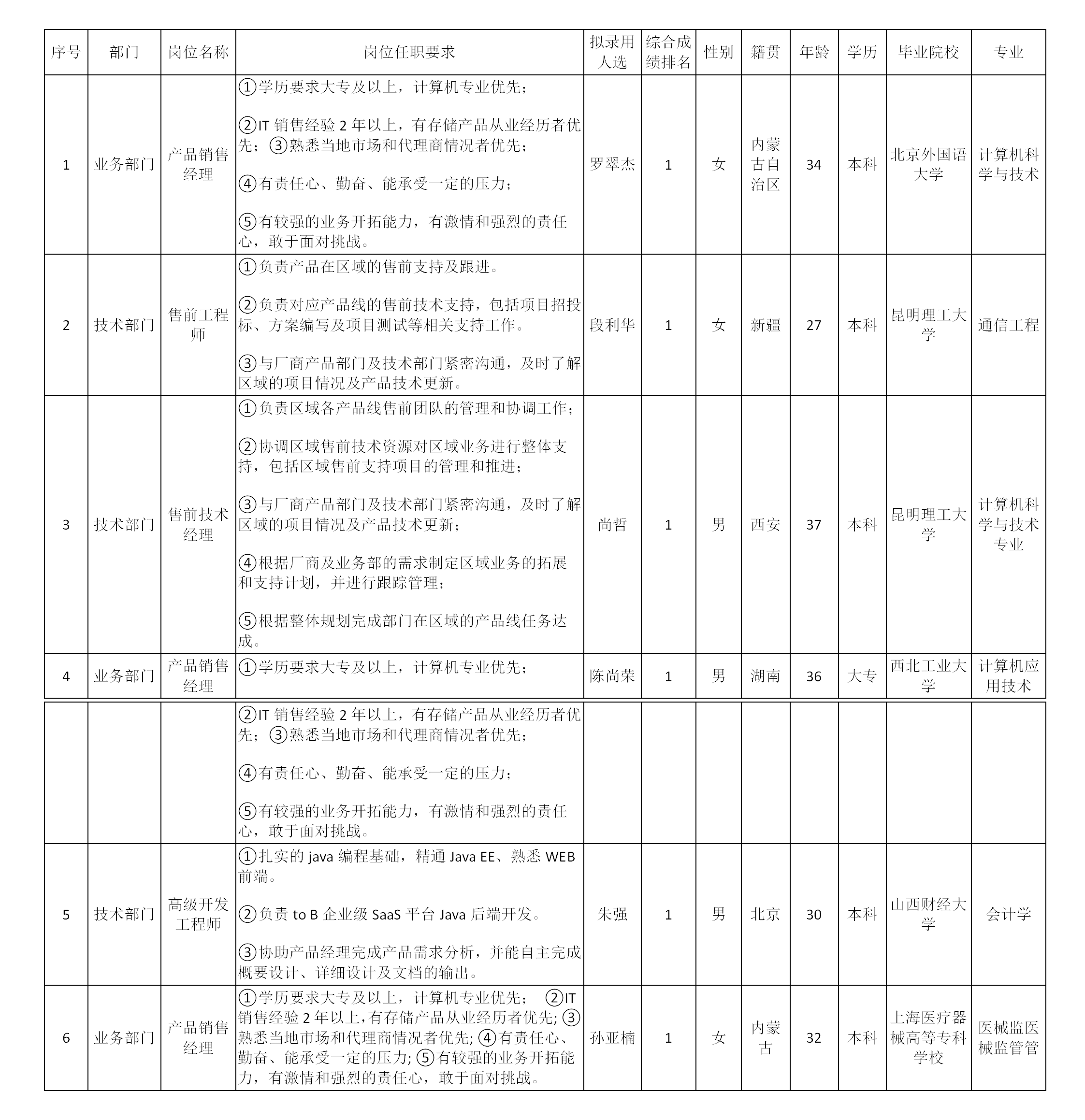 根據(jù)四川長虹佳華信息產(chǎn)品有限責任公司發(fā)布的招聘公告及招聘相關(guān)規(guī)定,經(jīng)筆試、面試、考察、體檢等程序,擬錄用羅翠杰、段利華、尚哲、陳尚榮、朱強、孫亞楠同志到四川長虹佳華信息產(chǎn)品有限責任公司工作,現(xiàn)予以公示,具體情況如下: