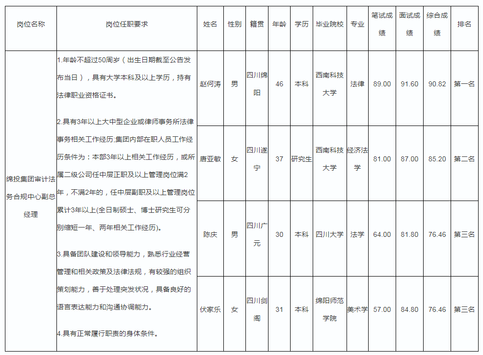 根據(jù)綿陽市投資控股(集團)有限公司關于審計法務合規(guī)中心副職市場化選聘的公告及招聘相關規(guī)定,經(jīng)筆試、面試等程序,現(xiàn)將競聘成績予以公示。
