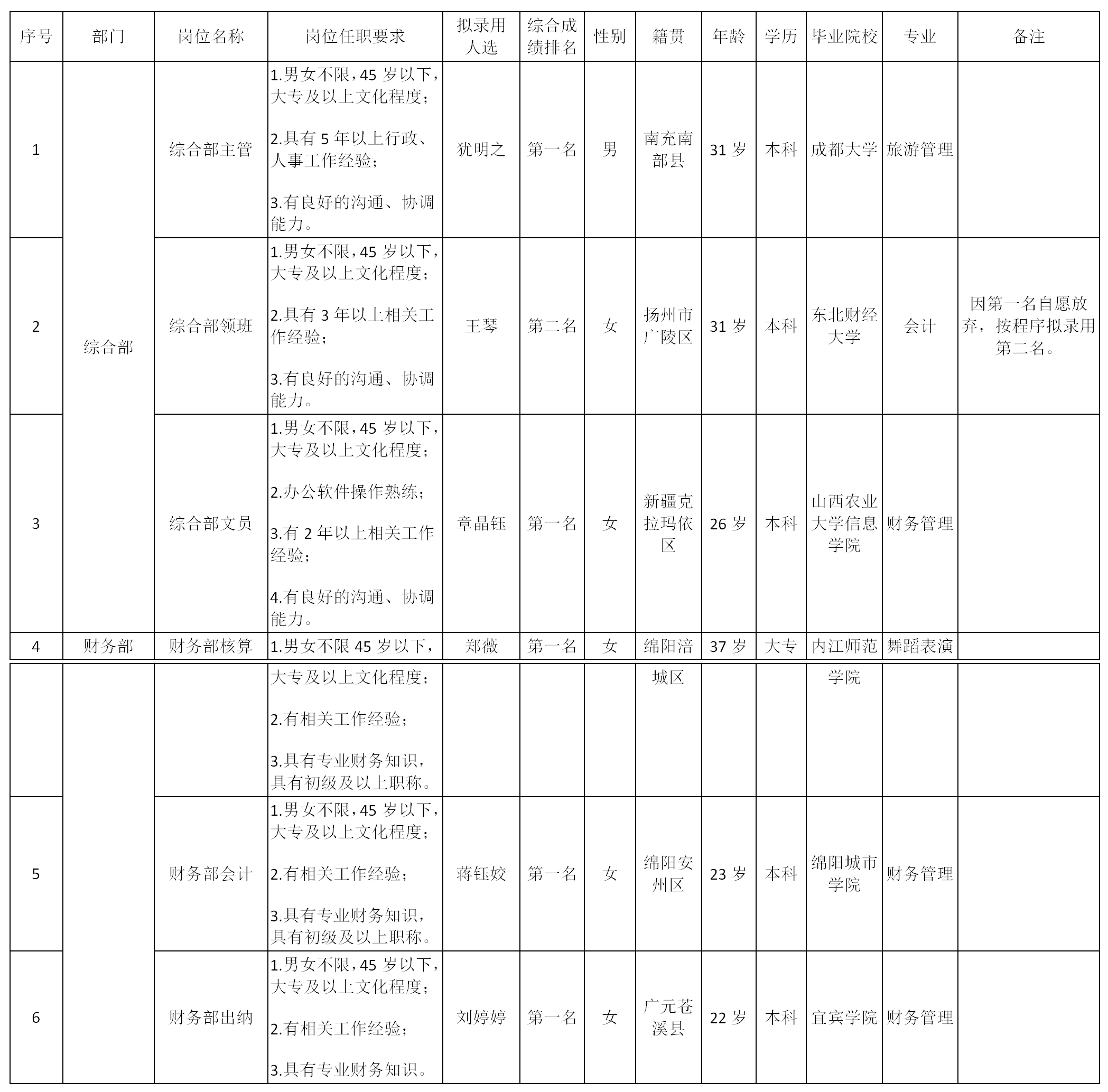 根據綿陽市綿州嘉來會務服務有限公司發(fā)布的招聘公告及招聘相關規(guī)定,經面試、筆試、背景調查、體檢等程序,擬錄用以下人員到綜合部、財務部工作,現(xiàn)予以公示,具體情況如下: