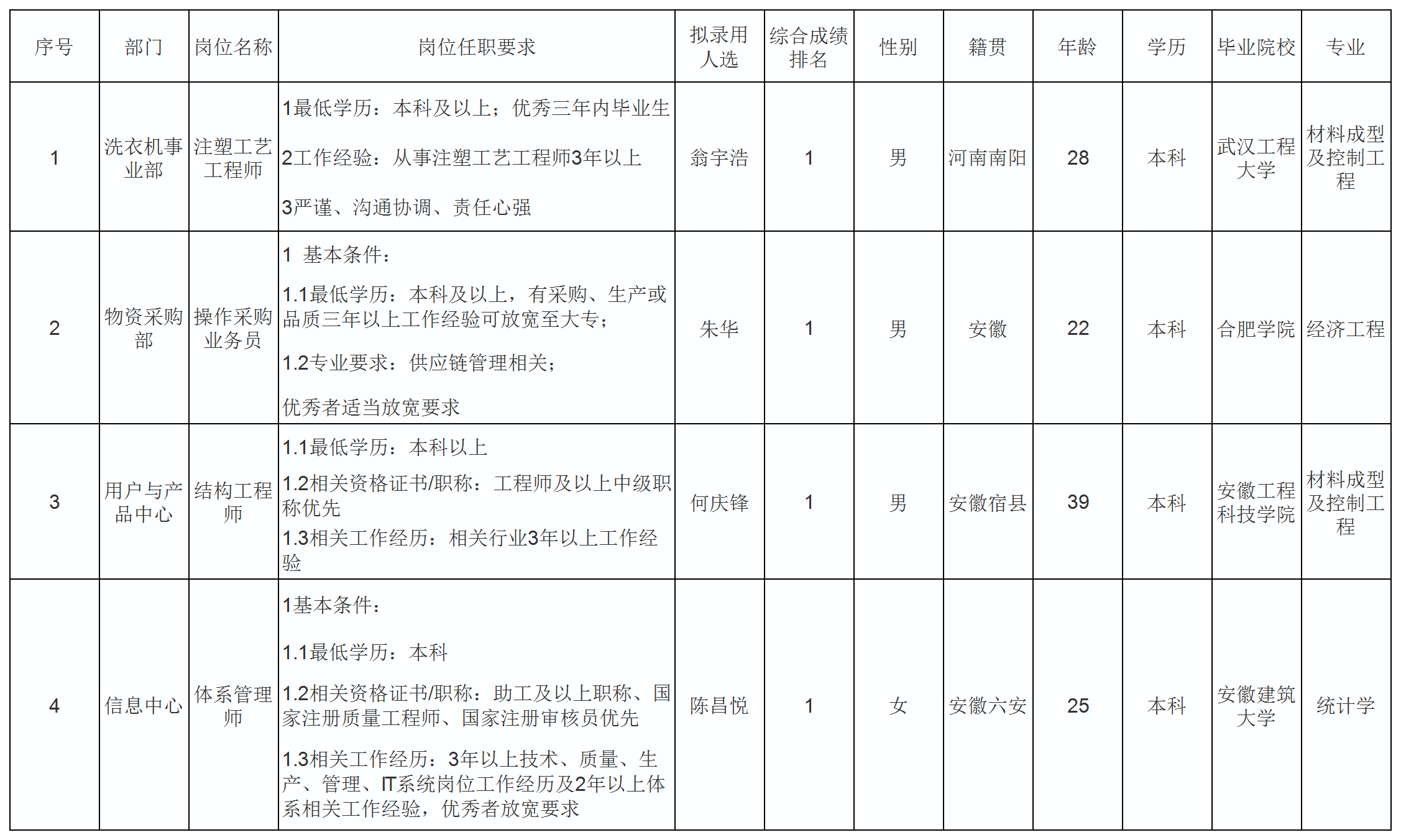 根據(jù)長虹美菱股份有限公司發(fā)布的招聘公告及招聘相關規(guī)定,經筆試、面試、考察、體檢等程序,擬錄用翁宇浩等同志到洗衣機事業(yè)部部門工作,現(xiàn)予以公示,具體情況如下:
