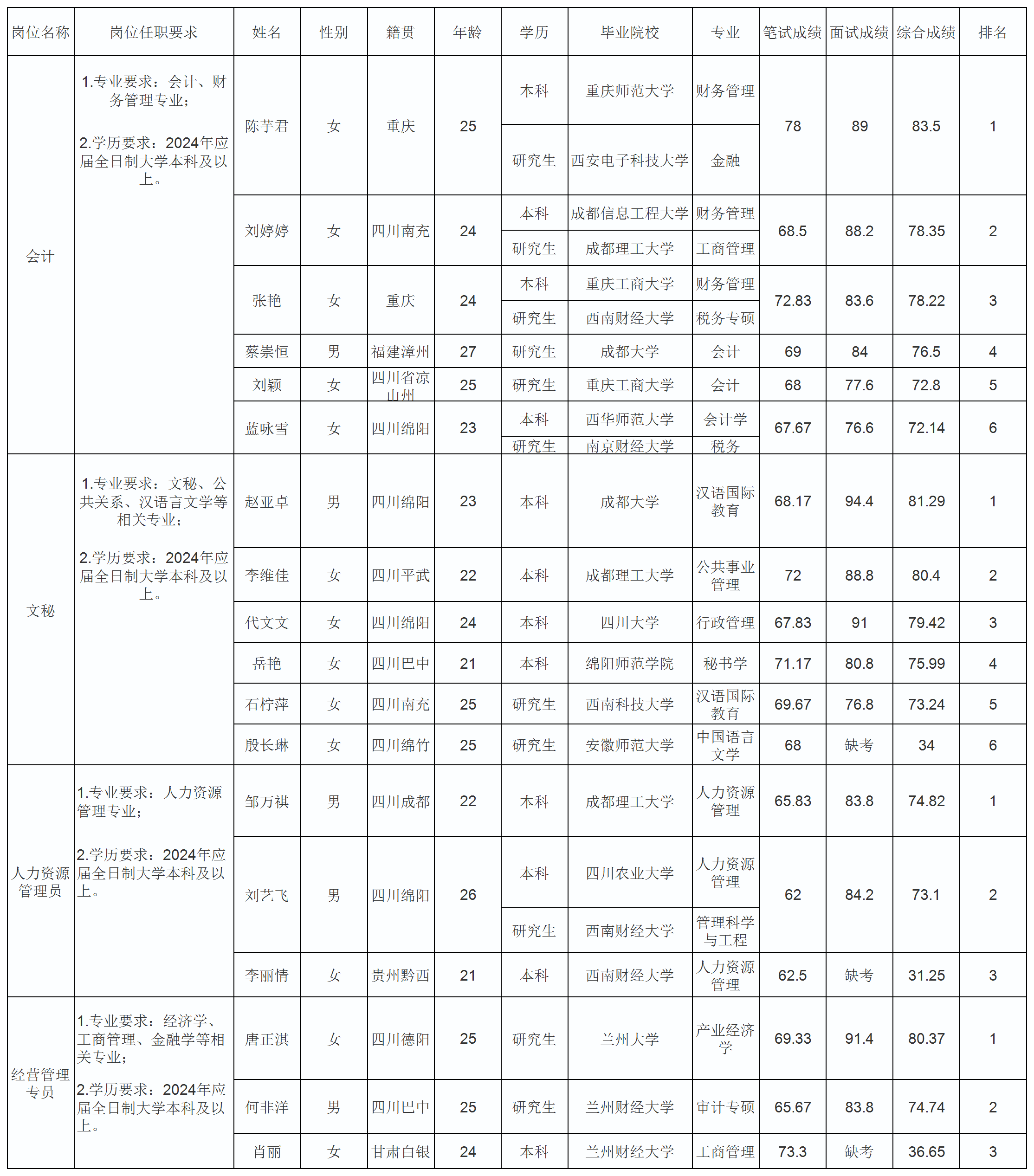 根據(jù)綿陽市水務(wù)(集團)有限公司發(fā)布的招聘公告及招聘相關(guān)規(guī)定,經(jīng)筆試、面試等程序,現(xiàn)將筆試(面試)成績予以公示。