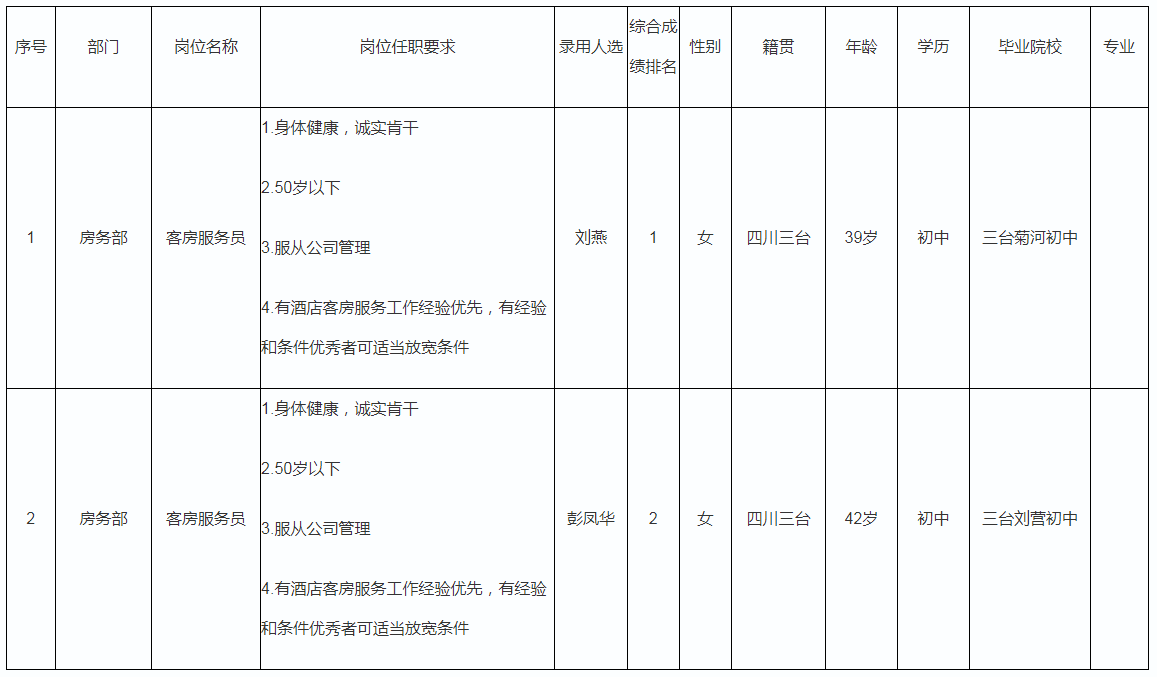 根據(jù)四川梓樂(lè)文化旅游開(kāi)發(fā)有限公司發(fā)布的招聘公告及招聘相關(guān)規(guī)定,經(jīng)面試、考察、體檢等程序,錄用劉燕、彭鳳華兩位同志到梓州明宇麗雅酒店工作,現(xiàn)予以公示,具體情況如下: