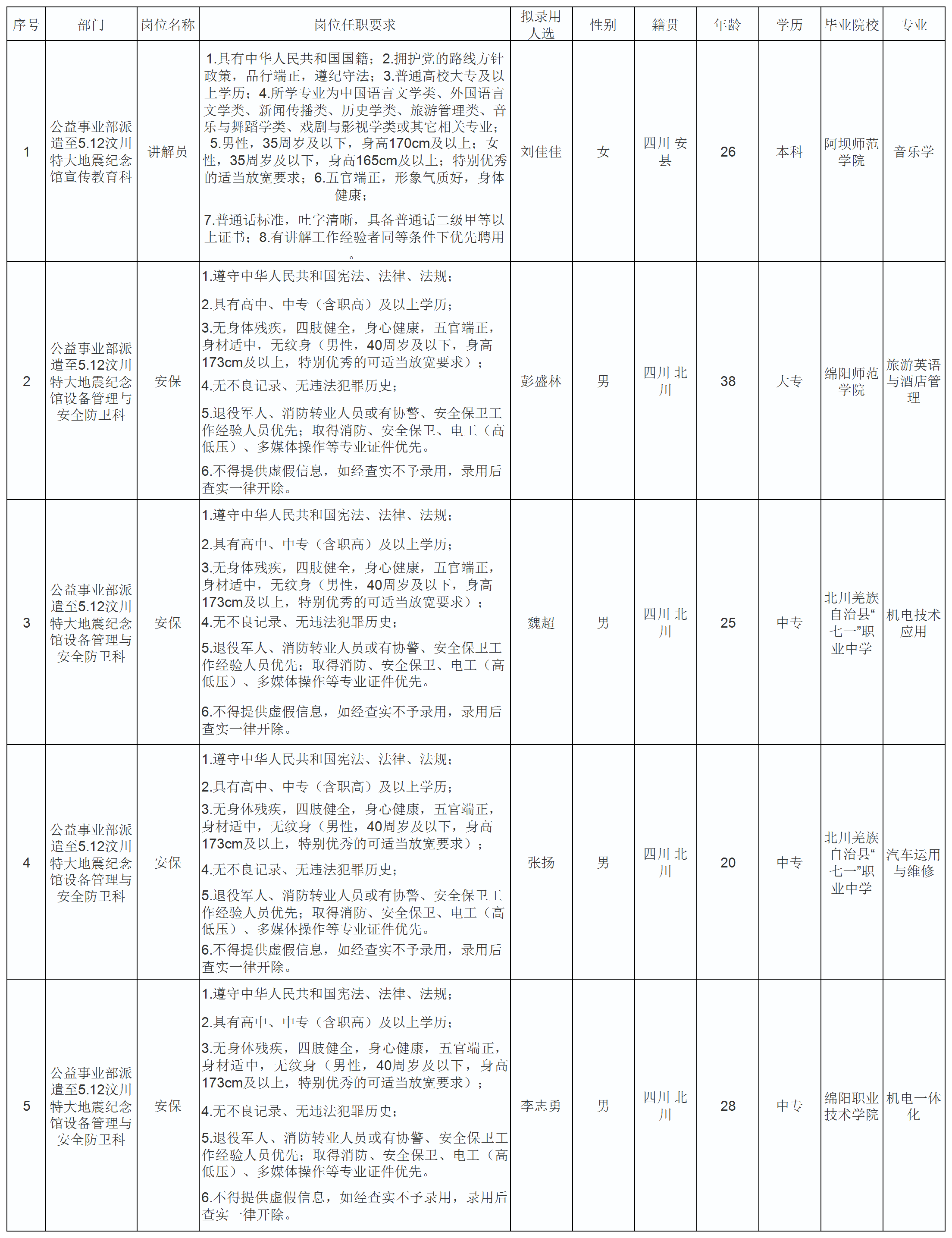 根據(jù)綿陽市匯澤投資有限公司發(fā)布的招聘公告及招聘相關(guān)規(guī)定,經(jīng)公開報(bào)名、資格審查、面試考核、體檢、現(xiàn)場考核等程序,擬聘劉佳佳同志到匯澤公司公益事業(yè)部派遣至5.12汶川特大地震紀(jì)念館宣傳教育科講解員崗位工作;擬聘彭盛林、魏超、張揚(yáng)、李志勇四名同志到匯澤公司派遣至5.12汶川特大地震紀(jì)念館設(shè)備管理與安全防衛(wèi)科安保崗位工作?,F(xiàn)將擬聘人選情況予以公示: