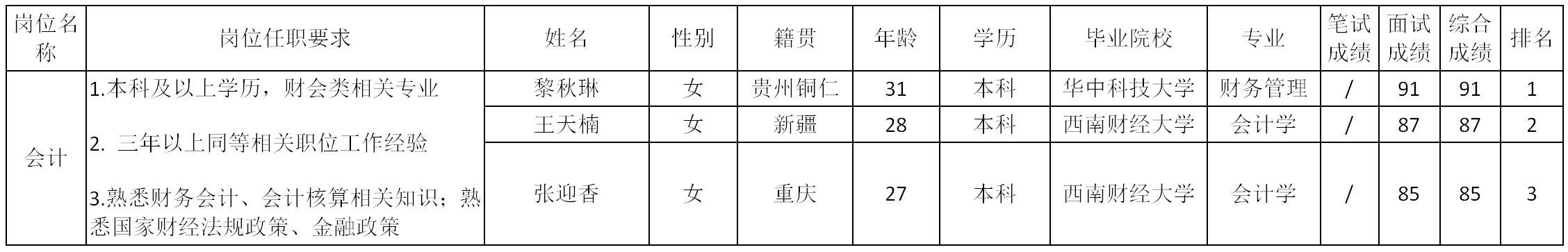 根據(jù)四川波鴻實(shí)業(yè)有限公司發(fā)布的招聘公告及招聘相關(guān)規(guī)定,經(jīng)面試后,將四川波鴻實(shí)業(yè)有限公司會(huì)計(jì)崗位面試成績(jī)予以公示。