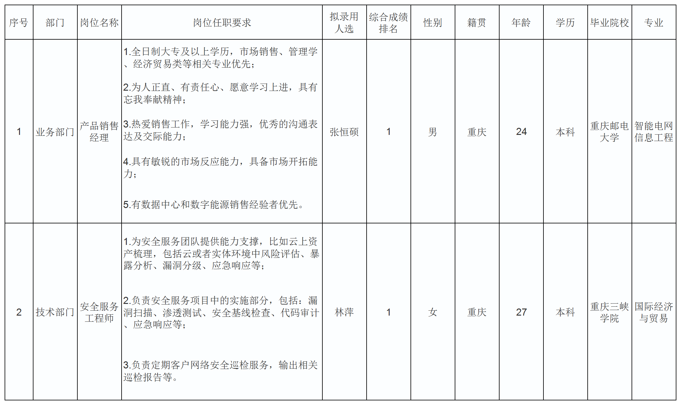 根據(jù)四川長虹佳華信息產(chǎn)品有限責(zé)任公司發(fā)布的招聘公告及招聘相關(guān)規(guī)定,經(jīng)筆試、面試、考察、體檢等程序,擬錄用張恒碩、林萍同志到四川長虹佳華信息產(chǎn)品有限責(zé)任公司工作,現(xiàn)予以公示,具體情況如下: