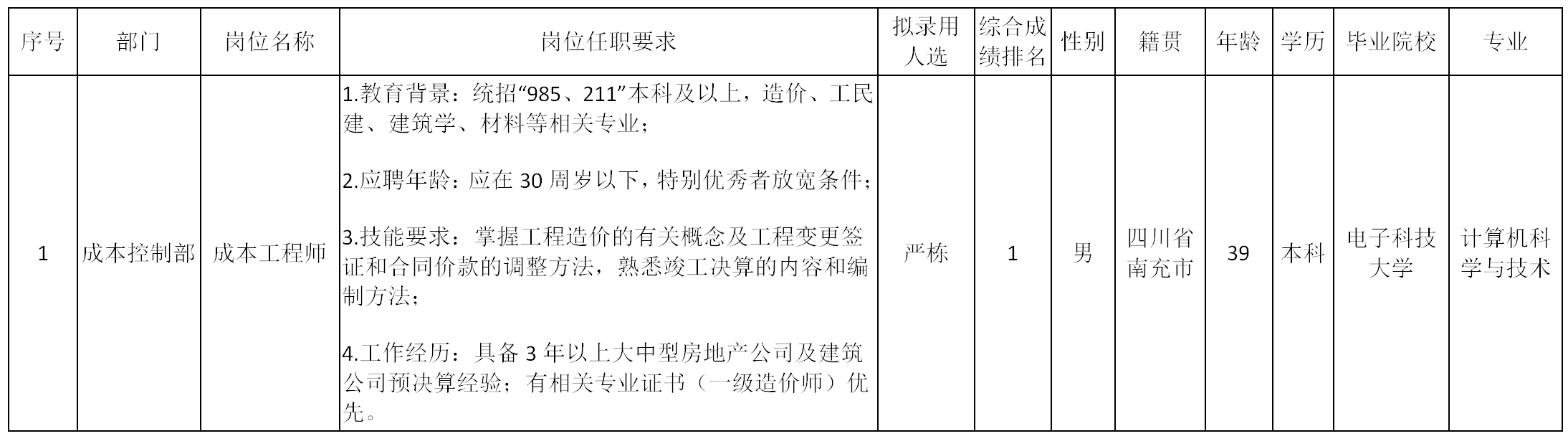 根據(jù)四川波鴻實業(yè)有限公司發(fā)布的招聘公告及招聘相關(guān)規(guī)定,經(jīng)初試、復(fù)試、考察、體檢等程序,擬錄用嚴(yán)棟到綿陽萬鴻房地產(chǎn)開發(fā)有限公司成本工程師崗位工作,現(xiàn)予以公示,具體情況如下: