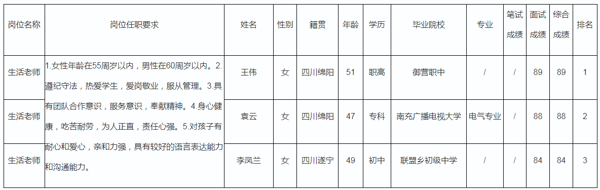 根據(jù)綿陽中學(xué)實驗學(xué)校發(fā)布的招聘公告及招聘相關(guān)規(guī)定,經(jīng)面試等程序,現(xiàn)將成績予以公示。
