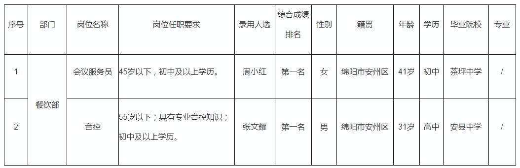 根據(jù)綿陽(yáng)市綿州嘉來(lái)會(huì)務(wù)服務(wù)有限公司發(fā)布的招聘公告及招聘相關(guān)規(guī)定,經(jīng)面試、體檢等程序,錄用以下人員到餐飲部工作,現(xiàn)予以公示,具體情況如下: