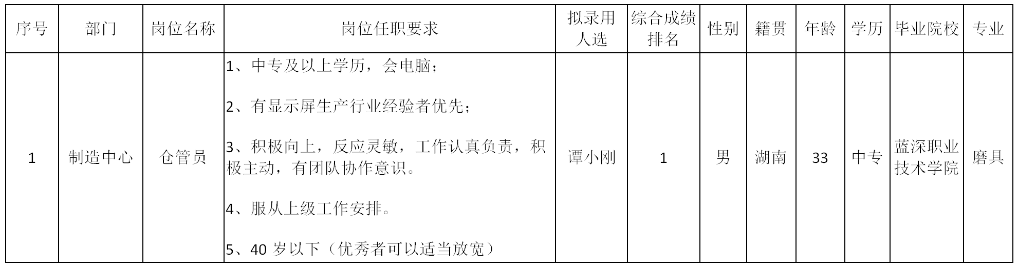 根據(jù)深圳市九洲光電科技有限公司發(fā)布的招聘公告及招聘相關(guān)規(guī)定,經(jīng)筆試、面試、考察、體檢等程序,擬錄用譚小剛同志到深圳市九洲光電科技有限公司工作,現(xiàn)予以公示,具體情況如下: