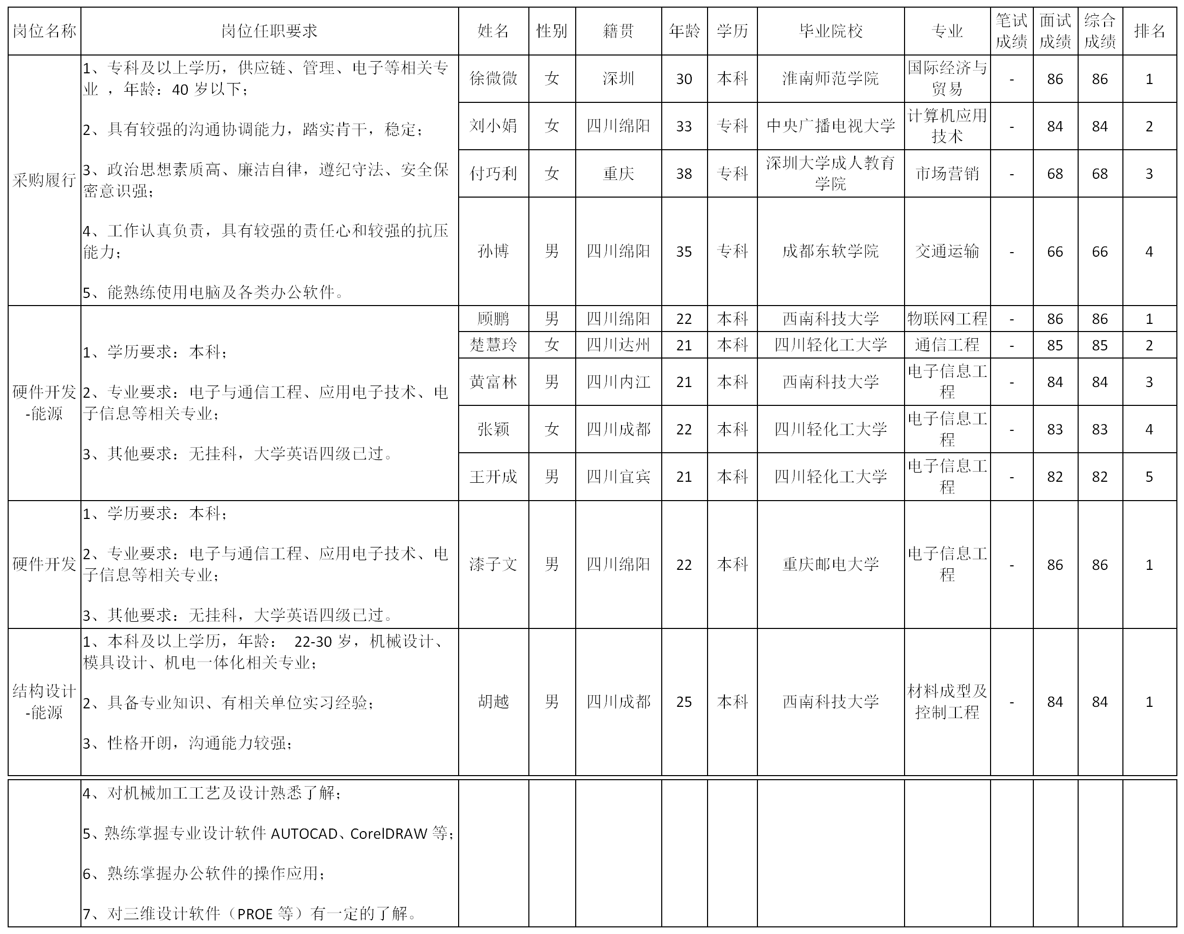 根據(jù)四川九州電子科技股份有限公司發(fā)布的招聘公告及招聘相關(guān)規(guī)定,經(jīng)筆試、面試等程序,現(xiàn)將筆試(面試)成績(jī)予以公示。