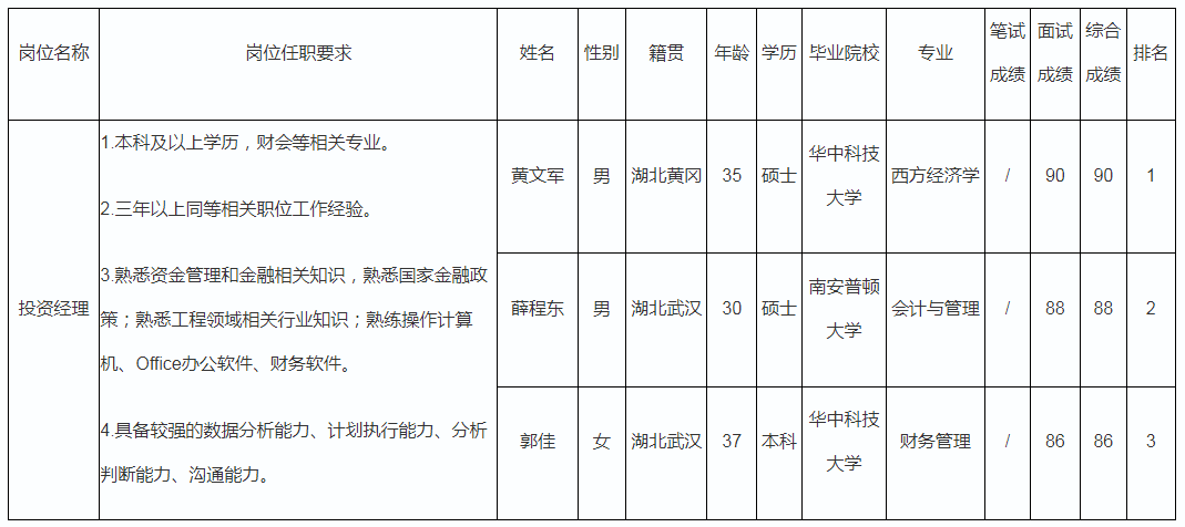 根據(jù)四川波鴻實業(yè)有限公司發(fā)布的招聘公告及招聘相關規(guī)定,經(jīng)面試后,將四川波鴻實業(yè)有限公司投資經(jīng)理崗位面試成績予以公示。
