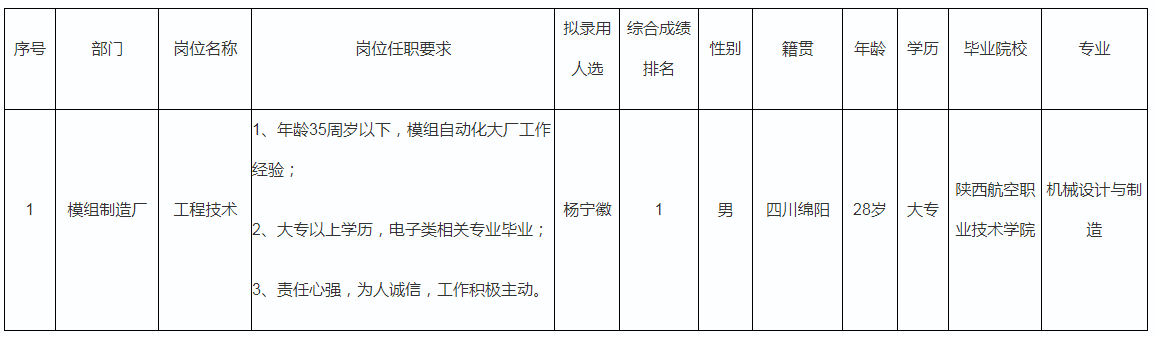 根據(jù)四川愛(ài)聯(lián)科技股份有限公司發(fā)布的招聘公告及招聘相關(guān)規(guī)定,經(jīng)筆試、面試、考察、體檢等程序,擬錄用楊寧徽同志到模組產(chǎn)品工藝工作,現(xiàn)予以公示,具體情況如下: