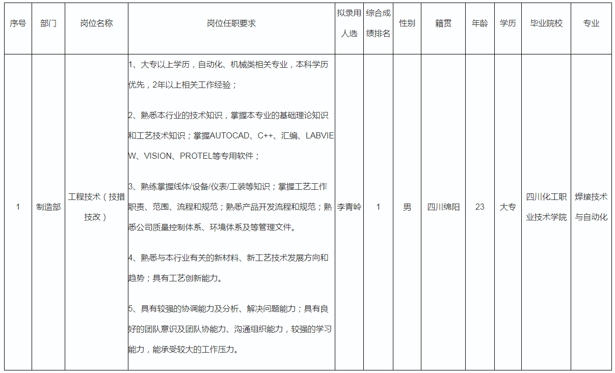 根據(jù)多媒體公司發(fā)布的招聘公告及招聘相關(guān)規(guī)定,經(jīng)筆試、面試、考察、體檢等程序,擬錄用李青嶺同志到制造部,現(xiàn)予以公示,具體情況如下: