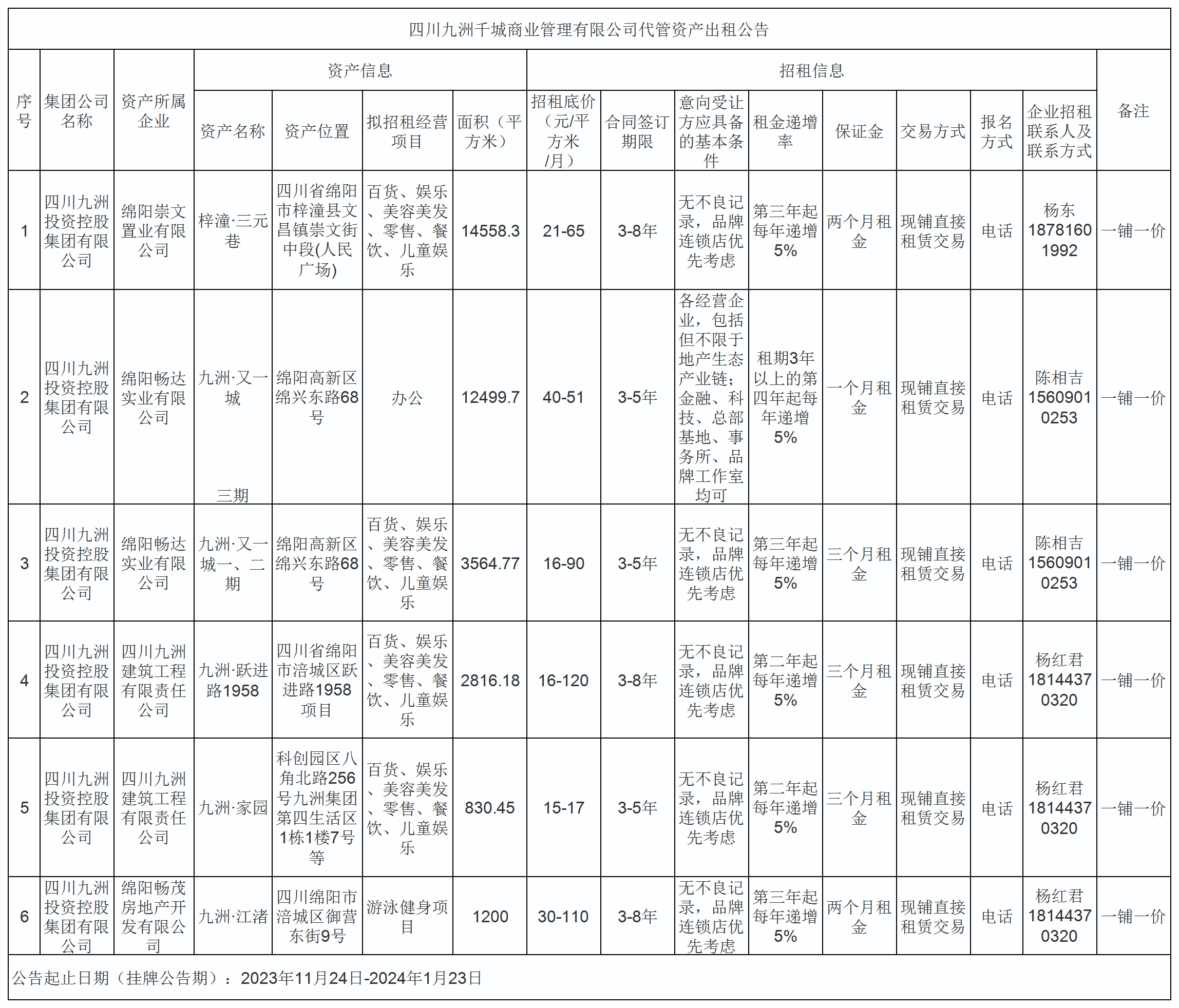 四川九洲千城商業(yè)管理有限公司代管資產(chǎn)出租公告