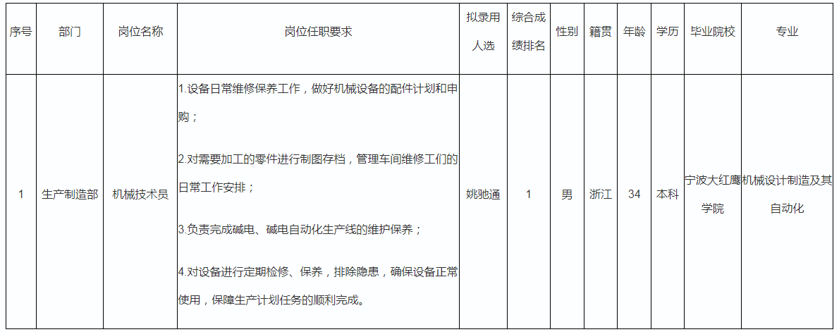 根據(jù)浙江長虹飛獅電器工業(yè)有限公司發(fā)布的招聘公告及招聘相關規(guī)定,經(jīng)筆試、面試、考察、體檢等程序,擬錄用姚馳通同志到浙江長虹飛獅電器工業(yè)有限公司工作,現(xiàn)予以公示,具體情況如下: