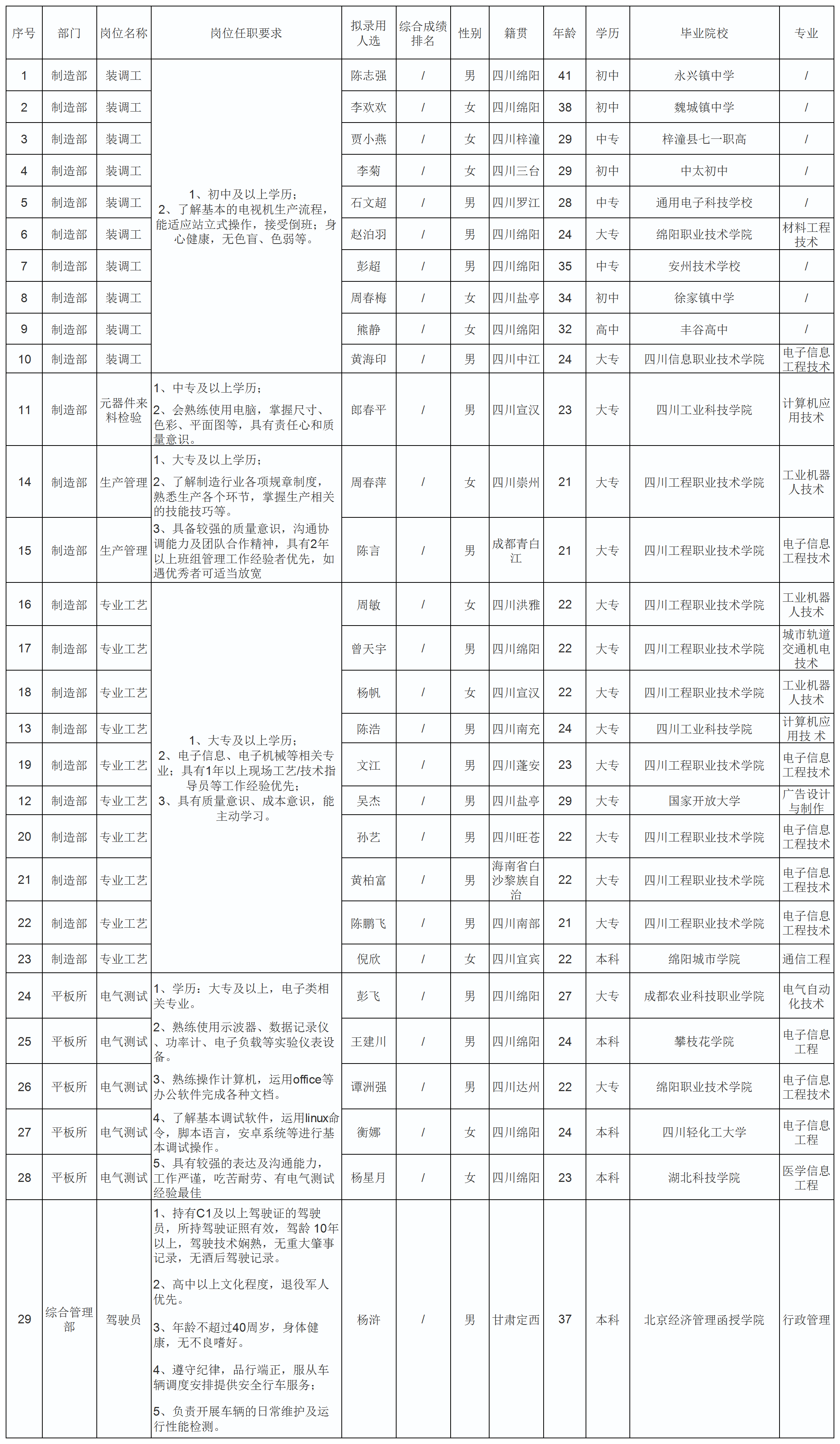 根據(jù)多媒體產(chǎn)業(yè)公司發(fā)布的招聘公告及招聘相關(guān)規(guī)定,經(jīng)面試、考察、體檢等程序,擬錄用以下29人分別到制造部、平板所、綜合管理部工作,現(xiàn)予以公示,具體情況如下:
