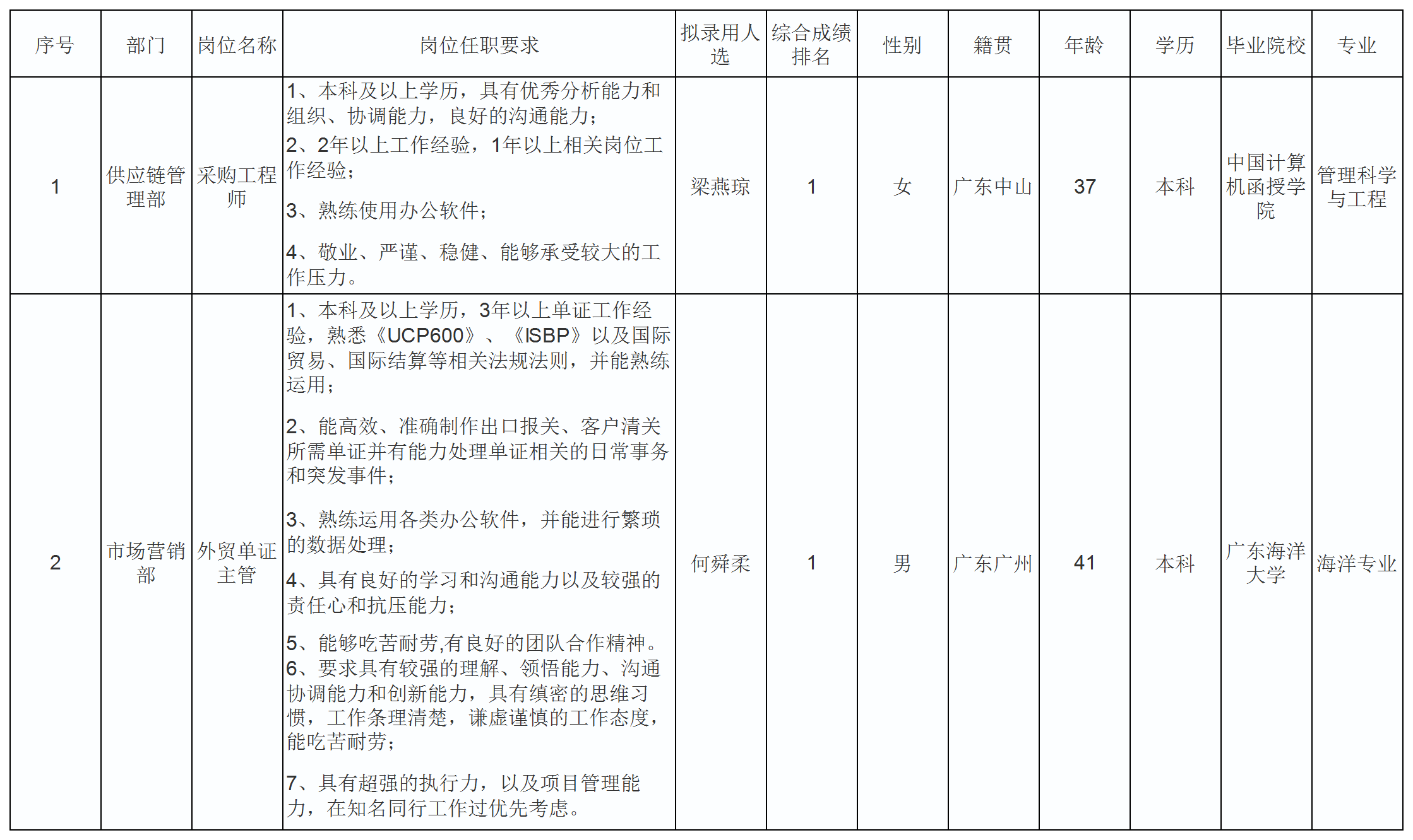 根據(jù)廣東長虹電子有限公司發(fā)布的招聘公告及招聘相關(guān)規(guī)定,經(jīng)面試、考察、體檢等程序,擬錄用梁燕瓊同志到供應(yīng)鏈管理部、何舜柔同志到市場營銷部工作,現(xiàn)予以公示,具體情況如下: