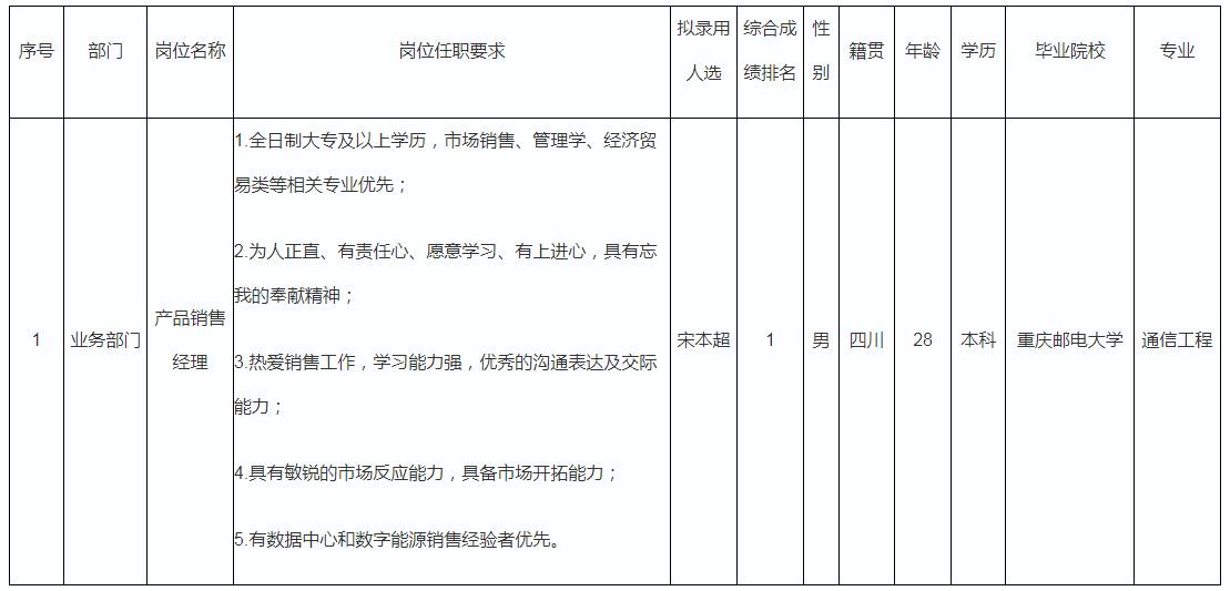 根據(jù)四川長(zhǎng)虹佳華信息產(chǎn)品有限責(zé)任公司發(fā)布的招聘公告及招聘相關(guān)規(guī)定,經(jīng)筆試、面試、考察、體檢等程序,擬錄用宋本超同志到四川長(zhǎng)虹佳華信息產(chǎn)品有限責(zé)任公司工作,現(xiàn)予以公示,具體情況如下: