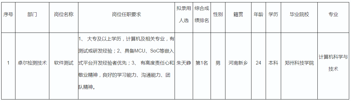 根據(jù)四川長(zhǎng)虹網(wǎng)絡(luò)科技有限責(zé)任公司發(fā)布的招聘公告及招聘相關(guān)規(guī)定,經(jīng)筆試、面試、考察、體檢等程序,擬錄用朱天崢同志到卓爾檢測(cè)技術(shù)部門,現(xiàn)予以公示,具體情況如下: