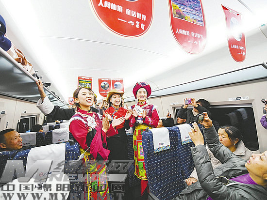隨著川青鐵路四川首段開通運(yùn)行,安州區(qū)告別了不通火車的歷史,一步邁入“動車時代”。圖為11月28日,在C6008次首發(fā)列車上,來自阿壩州民族歌舞團(tuán)的演員為乘客表演節(jié)目。(新華社記者 王曦 攝)