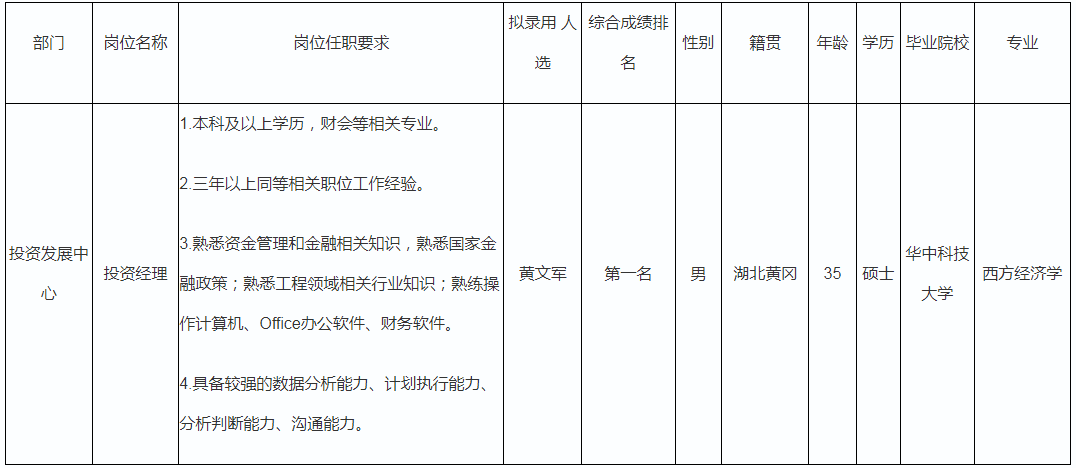 根據(jù)四川波鴻實(shí)業(yè)有限公司發(fā)布的招聘公告及招聘相關(guān)規(guī)定,經(jīng)面試綜合評(píng)估,擬錄用黃文軍為投資經(jīng)理,現(xiàn)予以公示,具體情況如下: