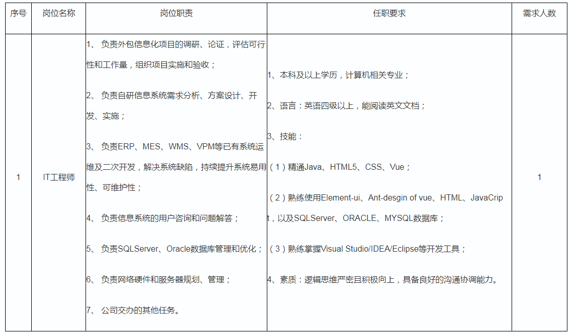 根據(jù)公司經(jīng)營管理需要,現(xiàn)面向公司外部公開招聘,崗位情況及需求人數(shù)如下: