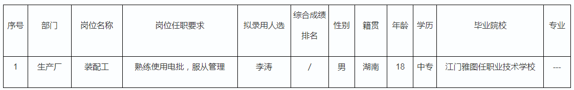 根據(jù)長虹美菱日電科技有限公司發(fā)布的招聘公告及招聘相關(guān)規(guī)定,經(jīng)面試、體檢等程序,擬錄用李濤同志到長虹美菱日電科技有限公司工作,現(xiàn)予以公示,具體情況如下: