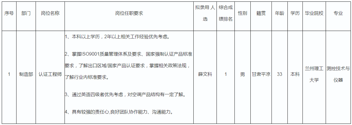 根據(jù)中山長(zhǎng)虹電器有限公司發(fā)布的招聘公告及招聘相關(guān)規(guī)定,經(jīng)面試、考察、體檢等程序,擬錄用薛文科同志到認(rèn)證工程師崗位工作,現(xiàn)予以公示,具體情況如下: