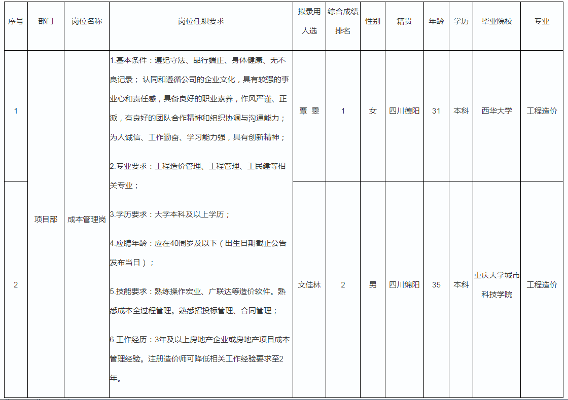 根據(jù)綿陽(yáng)市綿投置地有限公司發(fā)布的招聘公告及招聘相關(guān)規(guī)定,經(jīng)筆試、面試、背調(diào)、體檢等程序,擬錄用覃雯、文佳林兩名同志到綿陽(yáng)市綿投置地有限公司工作,現(xiàn)予以公示,具體情況如下: