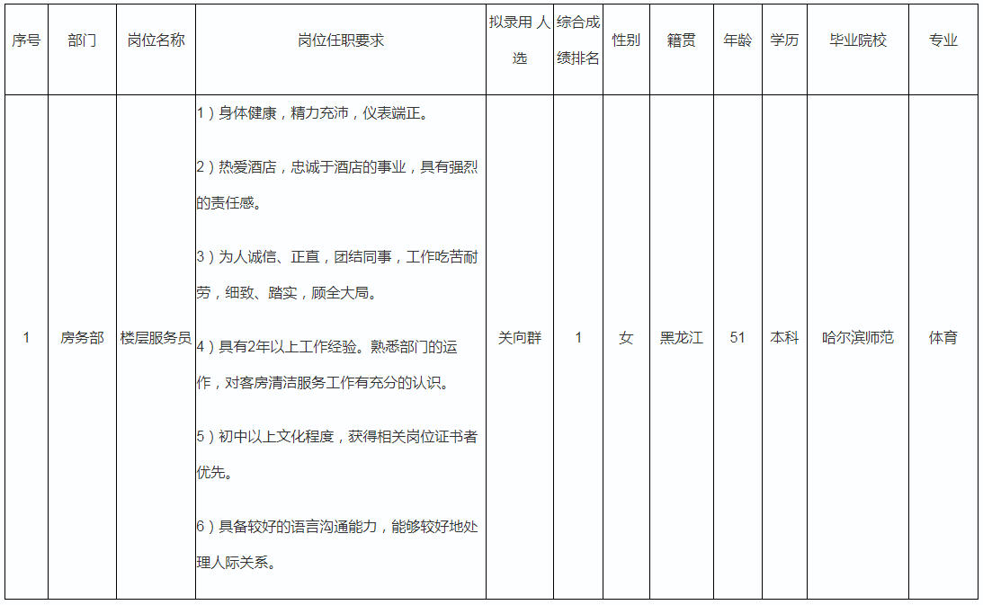 根據(jù)四川泰蒙斯酒店有限責(zé)任公司發(fā)布的招聘公告及招聘相關(guān)規(guī)定,經(jīng)筆試、面試、考察、體檢等程序,擬錄用關(guān)向群同志到泰蒙斯酒店工作,現(xiàn)予以公示,具體情況如下: