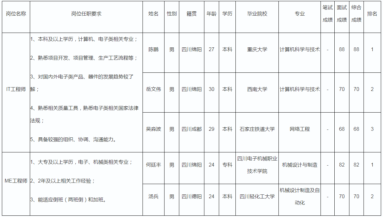 根據(jù)四川九州電子科技股份有限公司發(fā)布的招聘公告及招聘相關(guān)規(guī)定,經(jīng)筆試、面試等程序,現(xiàn)將筆試(面試)成績予以公示。