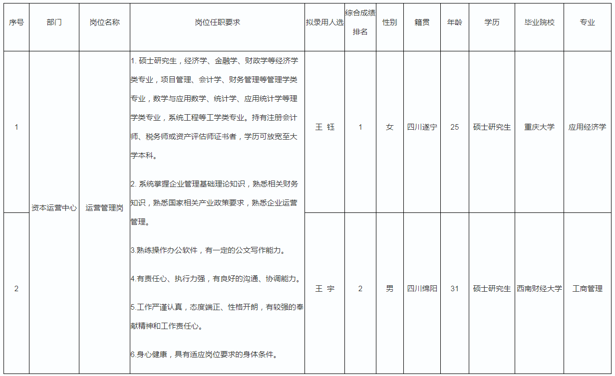 根據(jù)綿陽(yáng)市投資控股(集團(tuán))有限公司發(fā)布的招聘公告及招聘相關(guān)規(guī)定,經(jīng)筆試、面試、背景調(diào)查、體檢等程序,擬錄用王鈺、王宇兩名同志到綿陽(yáng)市投資控股(集團(tuán))有限公司工作,現(xiàn)予以公示,具體情況如下: