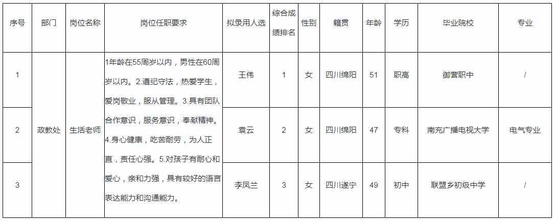 根據(jù)綿陽中學(xué)實驗學(xué)校發(fā)布的招聘公告及招聘相關(guān)規(guī)定,經(jīng)面試、考察、體檢等程序,擬錄用王偉等3名同志到綿陽中學(xué)實驗學(xué)校工作?,F(xiàn)予以公示,具體情況如下:
