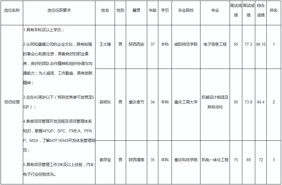 根據(jù)重慶九洲隆瓴科技有限公司發(fā)布的招聘公告及招聘相關(guān)規(guī)定,經(jīng)筆試、面試等程序,現(xiàn)將筆試(面試)成績予以公示。