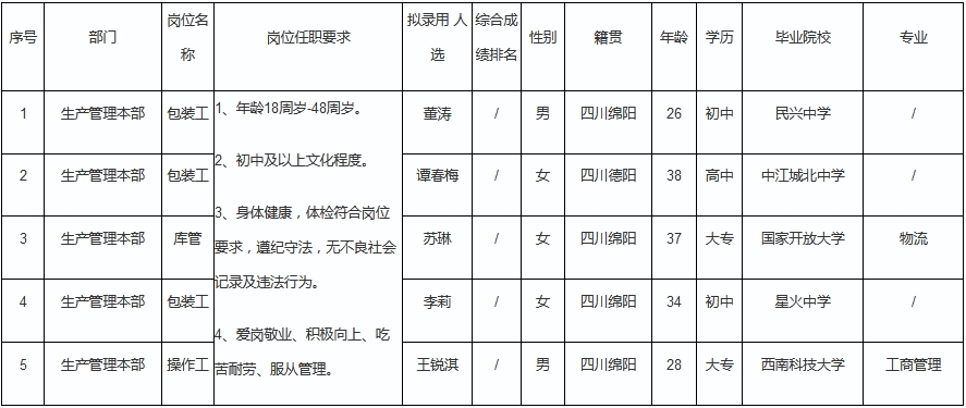 根據(jù)四川長虹新能源科技股份有限公司發(fā)布的招聘公告及招聘相關規(guī)定,經(jīng)面試、體檢等程序,擬錄用董濤等5名同志到四川長虹新能源科技股份有限公司工作,現(xiàn)予以公示,具體情況如下: