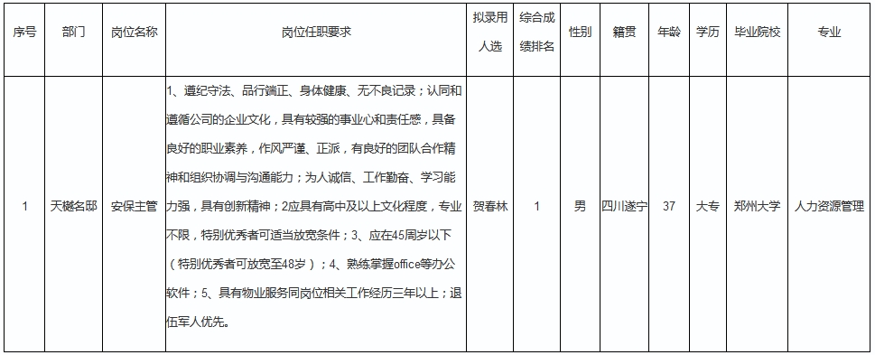 根據(jù)四川長(zhǎng)虹物業(yè)服務(wù)有限責(zé)任公司成都分公司發(fā)布的招聘公告及招聘相關(guān)規(guī)定,經(jīng)筆試、面試、考察、體檢等程序,擬錄用賀春林同志到天樾名邸管理處工作,現(xiàn)予以公示,具體情況如下: