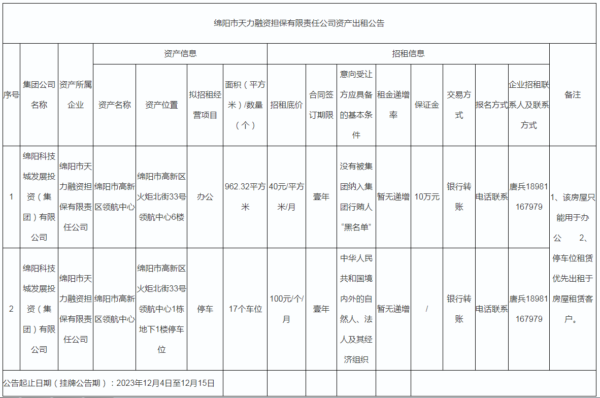 綿陽市天力融資擔(dān)保有限責(zé)任公司資產(chǎn)出租公告
