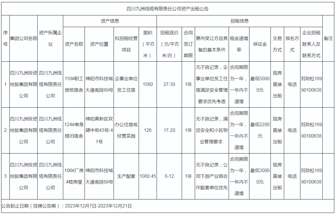 四川九洲線纜有限責(zé)任公司資產(chǎn)出租公告