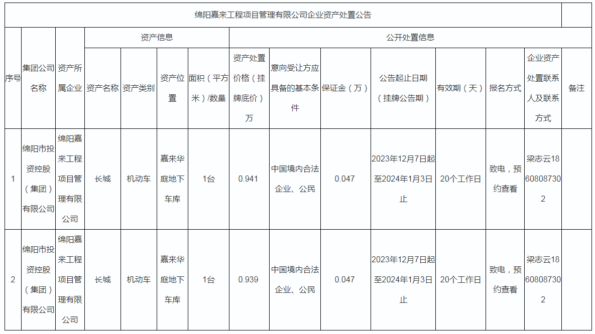 綿陽嘉來工程項目管理有限公司企業(yè)資產(chǎn)處置公告