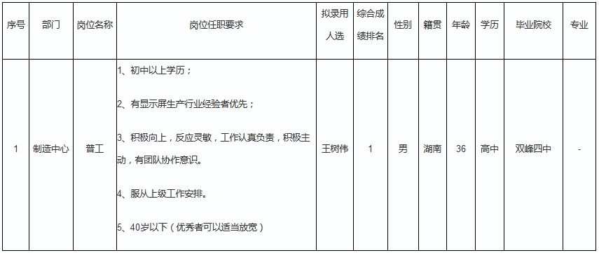 根據(jù)深圳市九洲光電科技有限公司發(fā)布的招聘公告及招聘相關規(guī)定,經(jīng)筆試、面試、考察、體檢等程序,擬錄用王樹偉同志到深圳市九洲光電科技有限公司工作,現(xiàn)予以公示,具體情況如下: