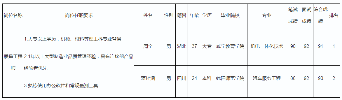 根據(jù)四川華芯鼎泰精密電子有限公司發(fā)布的招聘公告及招聘相關(guān)規(guī)定,經(jīng)筆試、面試等程序,現(xiàn)將筆試(面試)成績(jī)予以公示。