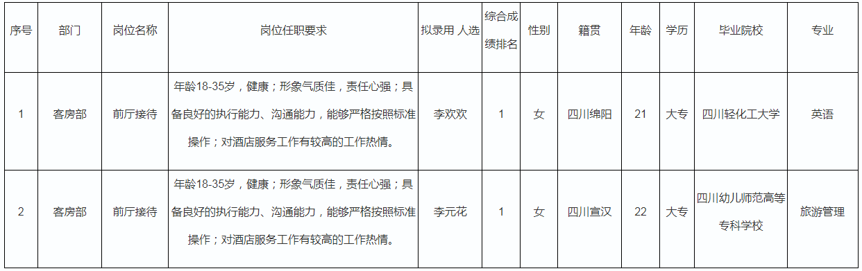 根據(jù)四川長虹仙海別院酒店發(fā)布的招聘公告及招聘相關(guān)規(guī)定,經(jīng)筆試、面試、考察、體檢等程序,擬錄用李歡歡、李元花等2名同志到仙海別院酒店工作,現(xiàn)予以公示,具體情況如下: